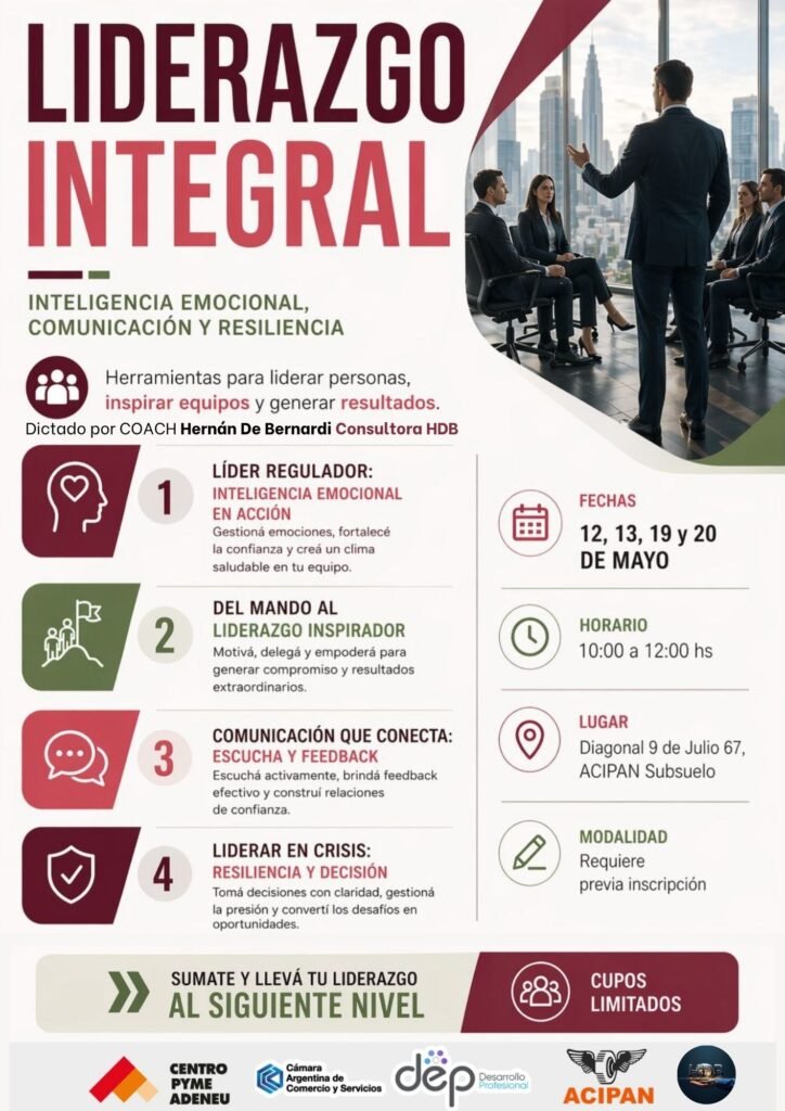 ACIPAN lo invita a participar del taller « Liderazgo integral: inteligencia emocional, comunicación y resiliencia » totalmente gratuita a dictarse en 4 jornadas los días 12, 13, 19 y 20 de Mayo desde las 10:00hs hasta las 12:00hs en ACIPAN Diagonal 9 de Julio 67 (Auditorio).
